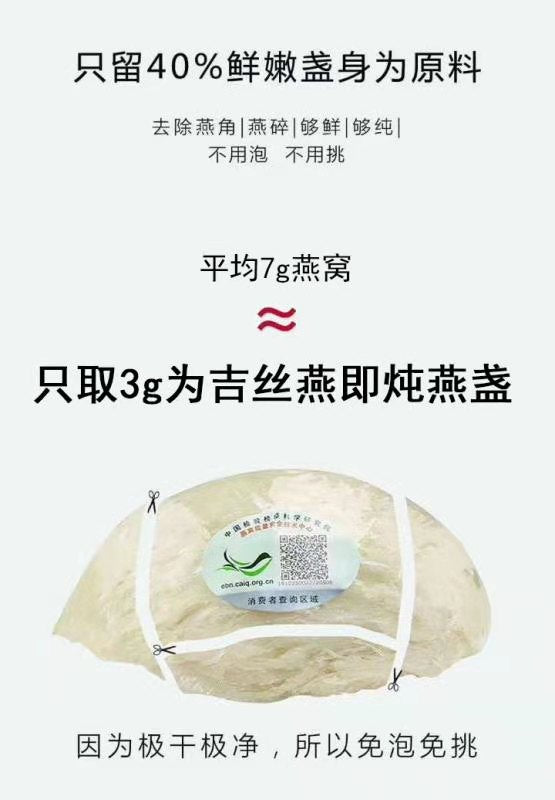在此基础上,采用全人工、去除边角、去除燕碎等杂质、去除率约达60%左右,唯留最纯净的鲜嫩燕盏精华部分。经丝丝挑毛,冷风恒温风干等工艺科学管理。唯有此工艺制作的燕窝,能最大限度杜绝食品安全问题、保留燕盏最多营养价值,达到免泡免挑,直接鲜炖现吃的王室甄选等级标准。